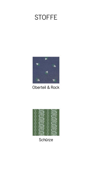 Oberteil und Rock: dunkler Blaudruck, grünes oder grün-weißes Streumuster