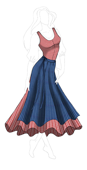 Oberteil und Rock: rot-weiße, rot-schwarze oder rot-grüne Karostoffe in Baumwolle, meist durchgewebt