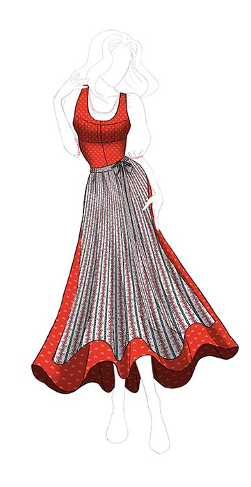 Oberteil und Rock: dunkelblauer oder hochroter Baumwolldruck mit weißem Streumuster