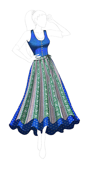 Die eingestickte Jakobsmuschel im Rückenteil wurde der Reichenfelser Festtagstracht entnommen. Das Muschelmotiv ist auch im Wappenknopf wiederzufinden. Das Sommerdirndl ist eine Neuschaffung aus dem Jahr 2020 von der Trachtengruppe Reichenfels in Zusammenarbeit mit der Wolfsberger Trachtenwerkstatt.